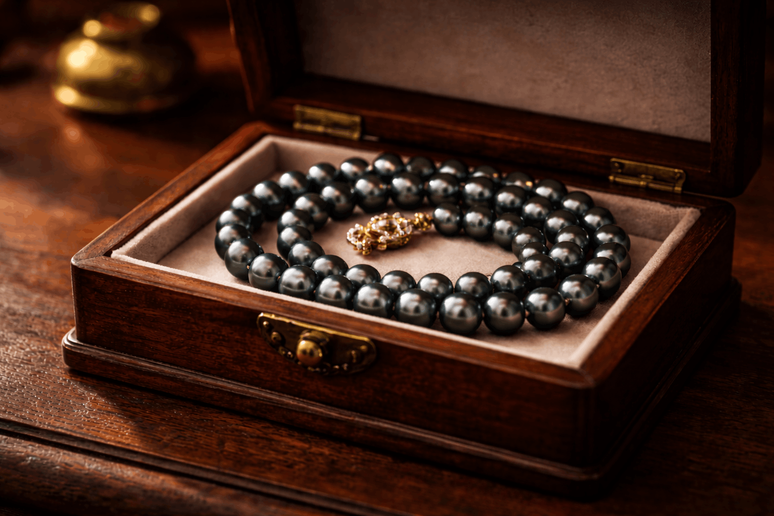 Black pearls need the same care as any fine pearl jewellery — maybe a touch more given Australia’s outdoor lifestyle and intense summers. Heat does the most damage. A hot car or prolonged direct sun dries out nacre steadily over time and eventually causes surface cracking. So keep your pearl necklace stored somewhere cool and dry and away from windows when not wearing it.