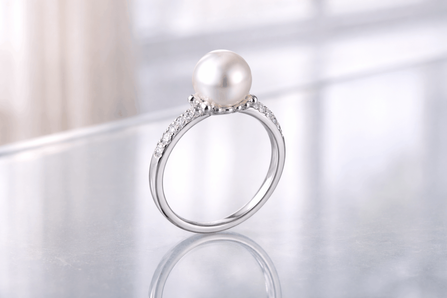 Halo settings surround the pearl with circle of small diamonds. This makes smaller pearls appear larger while adding serious sparkle factor. Works beautifully for 7-8mm pearls where you want more substantial visual impact. The diamonds also provide protection—if the ring bangs into something, diamonds take the hit rather than the pearl surface.